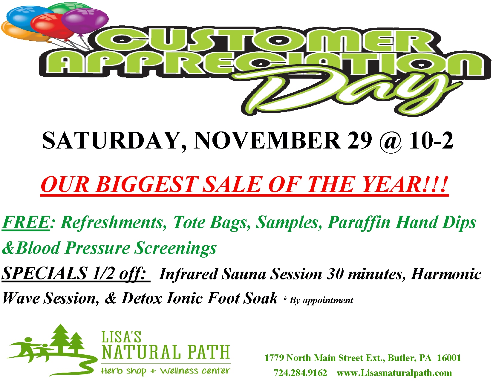 November 29 @ 10:00 am - 2:00 pm Customer Appreciation LISA'S NATURAL PATH 1779 North Main Street Extension, Kerr Business Center, Butler, PA, United States